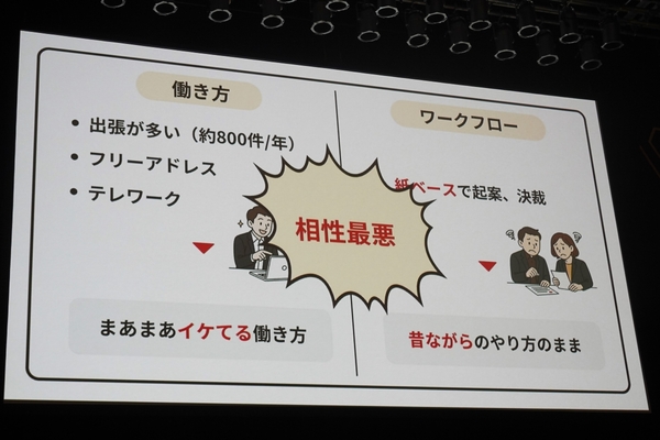 しかし、先進的な働き方を実践する一方で、“ワークフロー”だけは時代に取り残されていた。すべてが紙で運用され、昔ながらのやり方がそのまま残っていた。加えて、職員は出張で不在がちで、オフィスにいても誰がどこにいるか定まらない。この状況で紙の決裁を回すことは極めて非効率であり、当然膨大な時間を要していた。
