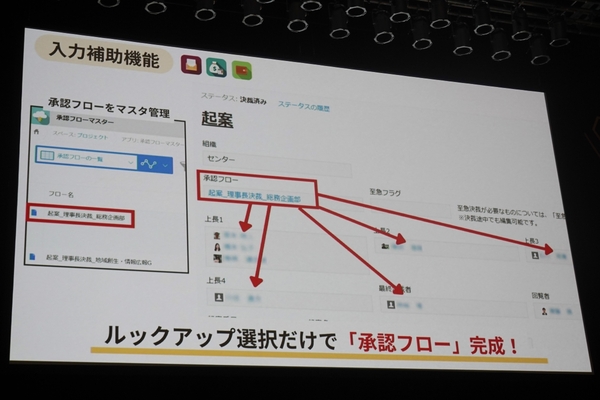 そこで、「承認フローマスター」アプリを別途開発。ユーザーは、起案の種類と最終決裁者、そして自身の所属を選択するだけで、適切な承認フローが自動設定される仕組みを構築した。