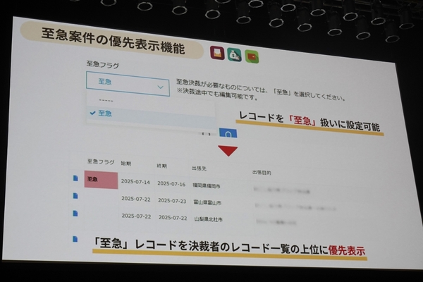 さらに、現場のニーズに応えて開発されたのが「至急案件の優先表示」の仕組みだ。至急扱いとなったレコードが、承認者側の画面で上位に分かりやすく表示される。決裁者は優先的に処理すべき案件を一目で把握できるようになり、迅速な意思決定を促している。
