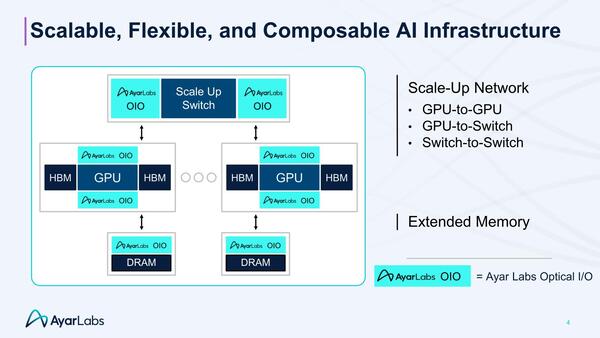 さて、Ayar Labsであるが、同社は2015年設立とこの業界では結構古参になる。当初から光インターコネクトの構築を目指しており、今では下の画像のような形でAIインフラを構築することを考えている。