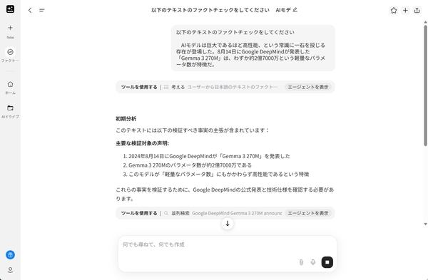 3つ目が、生成AIでファクトチェックすること。とはいえ、長い原稿をまるごとファクトチェックしようとすると漏れが出るので、段落単位でチェックするといい。プロンプトは「ファクトチェックして」でOK。その際は、別セッションで、できれば異なる生成AIサービスでチェックするといい。同じセッションだと、文脈を引き継いで問題なし、と回答する可能性が高まるからだ。