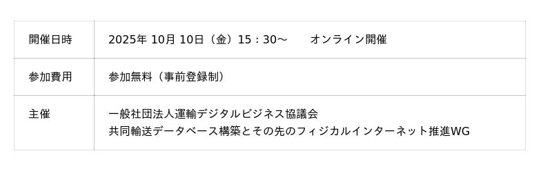10月10日(金)オンラインセミナー開催: 鈴与カーゴネット、AGC、ヤンマーロジスティクス、中部興産、北海道経済産業局が登壇。2026年1月までトライアルで無償利用が可能。