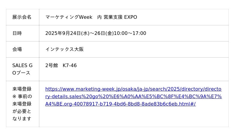 「データのチカラをすべての企業へ」をミッションに掲げるSALES GO株式会社(所在地:東京都中央区、代表取締役社長:内山 雄輝、以下SALES GO)は、2025年9月24日(水)~24日(金)、インテックス大阪で開催される「マーケティングWeek 大阪」に出展いたします。ブースでは、最新のマーケ・営業支援ツールやノウハウ、お客様事例を多数ご紹介いたします。