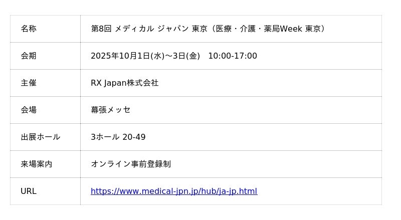 メディカル ジャパン 東京は、電子カルテや医療IT、働き方改革支援サービス、薬局システムなど、医療・介護現場の課題を解決するソリューションが集まる展示会です。出展社は実際の製品を展示し、来場者は「見て」「体験して」相談や商談ができる場となっています。