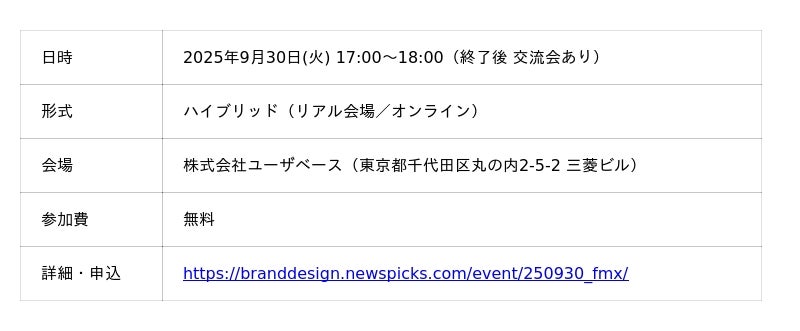 2025年9月30日(火)に開催されるNewsPicks Brand Design主催イベント「心を動かすコピーが、感動を創る。BtoBイベントにおけるエクスペリエンス設計の超具体」に、株式会社FIELD MANAGEMENT EXPAND (本社:東京都渋谷区、代表取締役社長:安田浩之、以下FMX)のExperience Marketing部門 チーフエグゼクティブ 守山航と、コピーライター/プランナー 樋口晃平が登壇します。