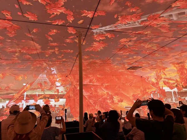 「Back to EXPO’70」では、最新の3DCG技術を駆使し、天井を含めた4面のプロジェクションマッピングにより、当時の大阪万博のパビリオンや会場風景を没入感あふれる映像空間として体験出来た。