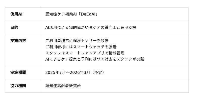 このたび、セントケア・ホールディング株式会社(本社:東京都中央区、代表取締役社長:藤間和敏)のグループ会社であるセントケアDX株式会社(本社:東京都中央区、代表取締役社長:谷口雅一)は、一般社団法人 認知症高齢者研究所(所長:羽田野政治)が共同研究に参画した認知症ケア補助AI「DeCaAI(でか~愛)」を、知的障がい者の方へのケアに応用する新たな検証プロジェクトを開始しました。