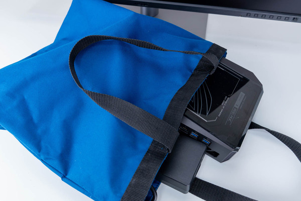 「ROG NUC 2025」は非常にコンパクトなので、カバンに入れて持ち運ぶことも容易だ。ACアダプターが大きいので、ノートPCのようにビジネスバックに詰めてというのは厳しいが、トートバッグのようなゆったりしたカバンなら余裕で入る。