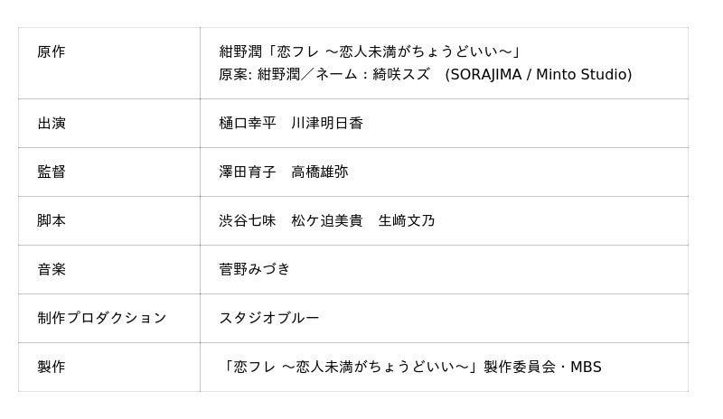 株式会社ソラジマ(代表取締役:萩原鼓十郎・前田儒郎、以下「ソラジマ」)は、株式会社Minto(代表取締役社長:水野和寛)との共同作品『恋フレ ~恋人未満がちょうどいい~』が実写ドラマ化され、10月2日(木)よりMBSドラマフィル枠で放送されることをお知らせいたします。