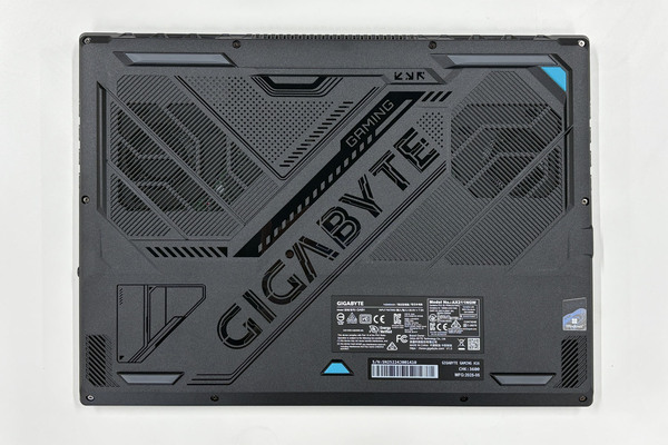 その他、強力なCPUとGPUを冷却するための吸排気スリットを側面や底面に備える。GIGABYTE独自の冷却技術「WINDFORCE冷却テクノロジ」を搭載し、2基の冷却ファンが筐体底面から強力に吸気してCPUとGPUを冷却している。ゲームなどの高負荷な作業中にこれらのスリットを塞がないよう十分な注意が必要だ。