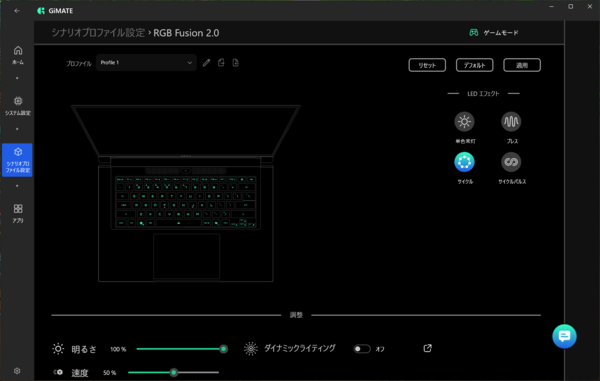 バックライトのRGB LEDはキーボード全体が同一色に光るタイプで、色や明滅パターンは付属のユーティリティソフト「GiMATE」から変更が可能だ。