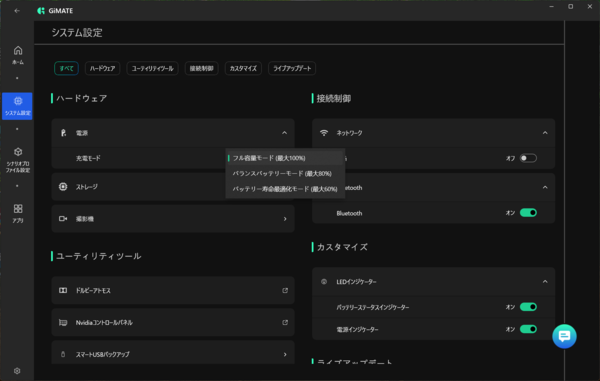 基本的にはバランスモードを設定しておけば大丈夫だが、最も高いパフォーマンスを発揮するのはゲームモードだ。今回の場合はGAMING A16 GA6Hのフルパワー性能を確認するため、各種検証はゲームモードに設定した上で進めている。
