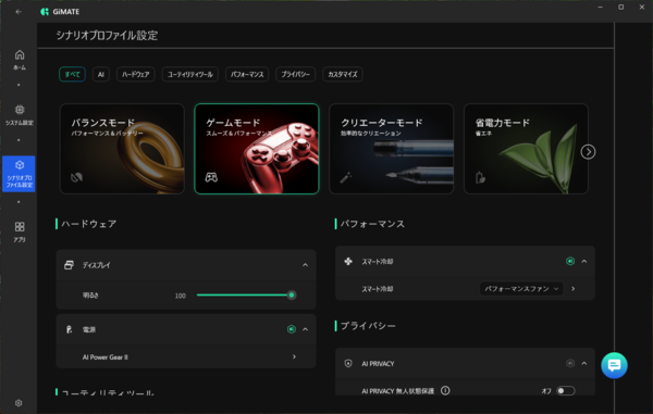 GAMING A16 GA6Hには動作モードなどを設定するシステム管理アプリ「GiMATE」が付属している。このGiMATEにはAIが組み込まれており、AIエージェントとして使用環境に合わせた最適な設定を行なってくれるのが特徴だ。