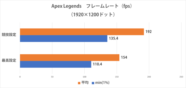 2本目は、軽~中量級の人気FPSタイトルApex Legendsでのフレームレート計測。グラフィック設定でアンチエイリアスを「TSAA」とし、テクスチャストリーミング4GB、テクスチャフィルタ異方性x4、モデルディテール最高以外は低設定とした「競技設定」と、すべてのオプションを最高の状態とした「最高設定」の2つの画質設定を用意。