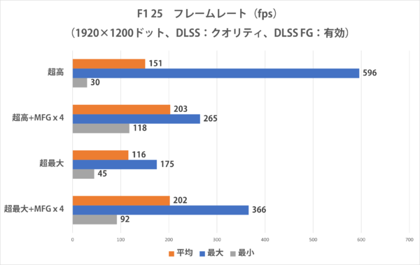 DLSSはクオリティ設定。フレーム生成のDLSS FGも有効な状態とした。F1 25はRTX 50シリーズのマルチフレーム生成にも対応しているので、各プリセットではDLSS MFGx4も試している。計測はゲーム内ベンチマークを利用し、ベンチマーク条件はサーキット「バーレーン」、天候「晴天」とした。