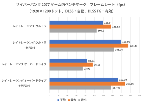 レイトレーシングがウルトラ設定では、平均フレームレートも最低フレームレートも両方100fps以上を維持できており、そのままでも快適なプレイが期待される。DLSS MFGx4を有効にすると、フレームレート倍増とまではいかないがさらに向上し、リフレッシュレート165Hzの液晶ディスプレーを存分に活かすところまでフレームレートが伸びている。