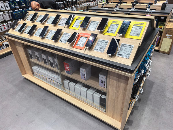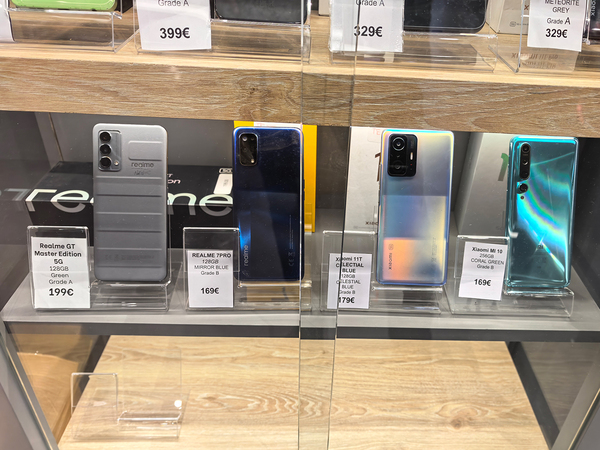 また、展示品処分コーナーもありました。だいぶ古い製品が手ごろな価格で売られていましたが、ここにrealmeを発見。数年前まではキプロスでも結構売られていたのでしょう。一番左のモデルは「realme GT Master Edition」。深澤直人氏がデザインした製品で、スーツケースをモチーフにしたデザインモデル。今となっては貴重な1品です。