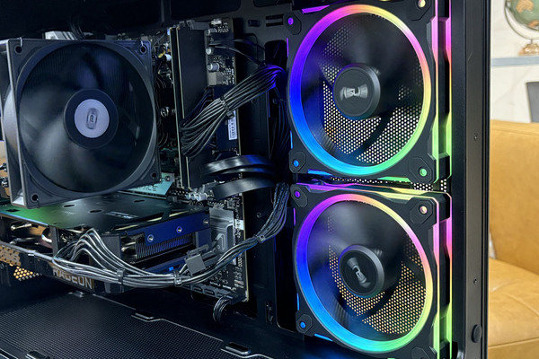 電源を入れると目を惹かれるのが、ライトアップ用のRGB LEDを内蔵した3つのケースファンだ。見た目に美しいというのはもちろんだが、実用面でも優秀。右側面と背面から排気を行ない、ケース内に熱をこもらすことなく、速やかに逃がせるよう工夫されている。