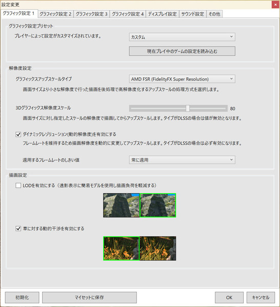 この機能を使うとスコアがどう変わるのか試してみよう。変更したのは「グラフィック設定1」にある設定。「3Dグラフィックス解像度スケール」を「80」とし、「ダイナミックレゾリューション(動的解像度)を有効にする」をオン、そして「適用するフレームレートのしきい値」を「常に適用」とした。