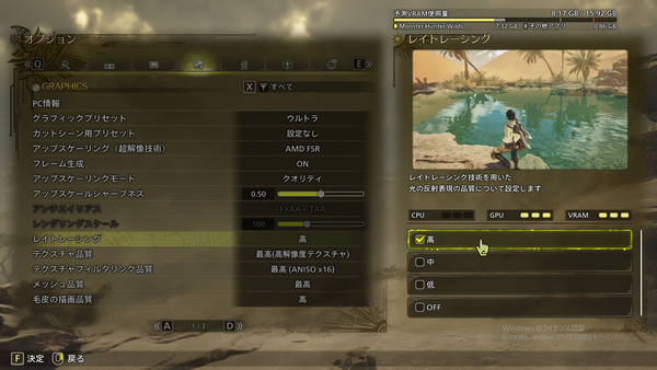 とはいえ、試用機の構成であれば、この推奨構成は余裕でクリアーできている。そこで、解像度を「WQHD」とし、グラフィックプリセット「ウルトラ」、フレーム生成「ON」、レイトレーシング「高」に設定して試してみよう。