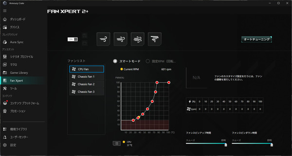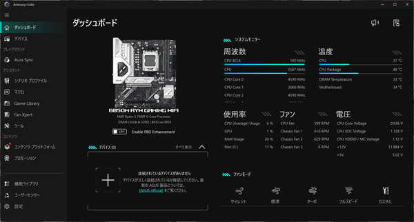 ASUS Armoury Crateは多機能で、ライトアップのカスタマイズのほか、動作クロックや温度の確認、ファン回転数の管理、ゲームソフトの管理といった機能が備わっている。