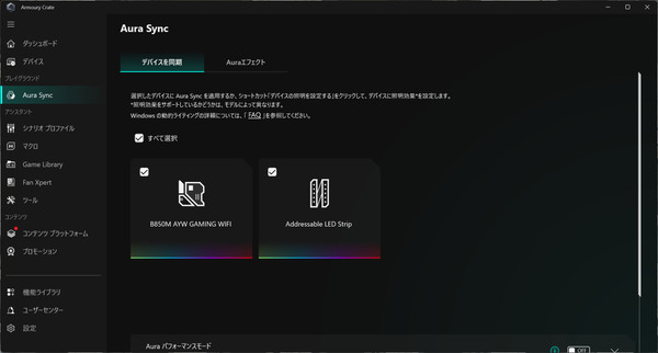 左のメニューから「Aura Sync」を選ぶと、色設定可能なデバイス一覧が表示されるので、設定したいものを選択。あとは、「Auraエフェクト」タブで色やパターンを変更するだけだ。
