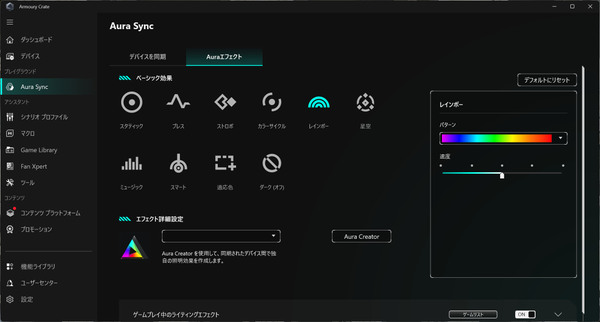 なお、基本的な発色パターンは用意されているので、選ぶだけでOK。よりこだわったライトアップ表現にチャレンジしたい場合は、Aura Creatorを使ってカスタマイズすることも可能だ。
