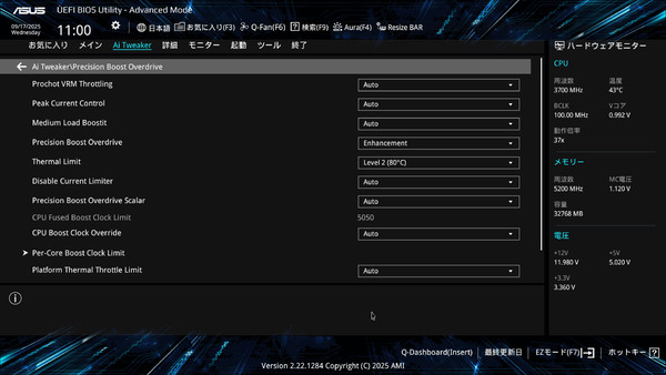 個人的に面白いと思ったのは、ダッシュボードにあった「Enable PBO Enhancement」のスイッチ。これはCPUの温度や電圧、電力を細かく制御し、より低い消費電力で高いパフォーマンスを実現するという機能(*)だ。