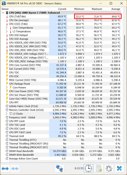 同じくCINEBENCH 2024のMulti Coreテストを実行し、終了直前の状態をチェックしてみたが、温度が大きく違う。最大温度は10.5度低い71.6度、平均温度でも8.5度低い69.6度と、大幅に温度が下がっているのだ。