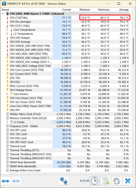 CPUの温度は最大82.1度、平均78.1度となっている。また、CPU Package Powerを見ると、最大82.388W、平均77.143Wとなっているのが確認できるだろう。