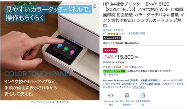 Amazonでは現在、HP(ヒューレット・パッカード)の最新A4複合プリンター「HP ENVY 6120」 がタイムセール対象商品として登場しています。