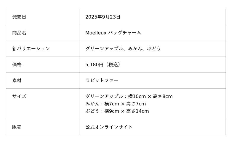 なお、「Moelleux バッグチャーム」シリーズは、全商品に共通して上質なラビットファーやウールを使用しており、思わず触れたくなるような柔らかな質感が特長です。手のひらに収まる愛らしいサイズ感と、集めて楽しむコレクション性の高さで、日常のファッションに彩りと楽しさをプラスします。
