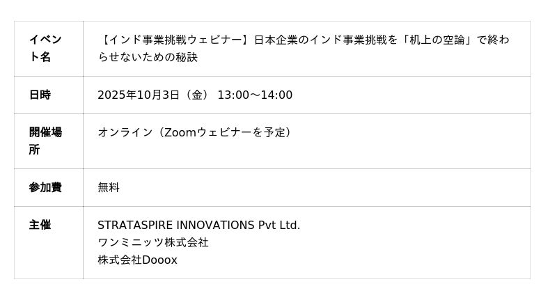 “行動で世の中を変えていく“を理念に掲げる株式会社Dooox(本社:東京都品川区、代表取締役:久保寺亮介)は、海外との会議に不可欠な多言語AI議事録ツール「One Minutes」を提供するワンミニッツ株式会社(本社:東京都港区、代表取締役:小守谷直毅)、STRATASPIRE INNOVATIONS Pvt Ltd.(本社:インド バンガロール、CEO:高橋三郎)と共催で、インド事業の成功確率を飛躍的に高めるための無料オンラインセミナーを2025年10月3日(金)に開催いたします。