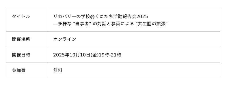 「リカバリーの学校@くにたち活動報告会2025 -多様な "当事者" の対話と参画による "共生圏の拡張"」眞山舎主催、10月10日にオンラインで開催