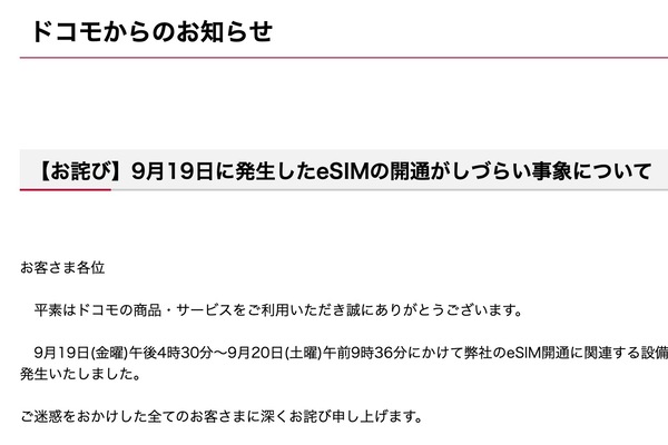 ドコモでは、9月19日午後4時30分頃から、eSIM対応端末でeSIMが正常に開通しにくい障害が発生した。原因は「設備故障」とされ、障害は9月20日午前9時36分に概ね復旧した。障害の影響で、eSIMを申し込む手続きやeSIMのみ対応の端末販売が一時停止された。特にiPhone 17シリーズのような、eSIMのみ対応の機種に対しては、ユーザーの混乱や不安がSNSなどで報告されていた。
