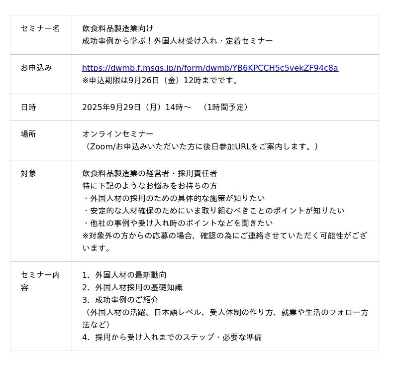 【飲食料品製造業・特定技能】9/29(月)成功事例から学ぶ!外国人材受け入れ・定着セミナー
