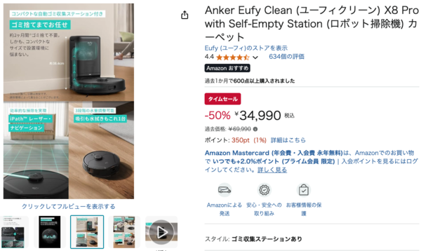 Amazonタイムセールで、Ankerの人気モデル 「Eufy Clean X8 Pro with Self-Empty Station」 が登場。通常価格69,990円 が、今だけ半額の34,990円に。さらに350ポイント還元まで付いてきます。