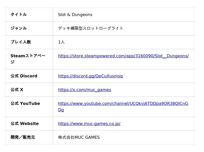 株式会社MUC GAMES(ムックゲームス)(東京都世田谷区、代表取締役社長:粟村 隆一)は、デッキ構築型スロットローグライト『Slot & Dungeons』のSteam早期アクセス版を2025年10月31日より配信開始することをお知らせいたします。