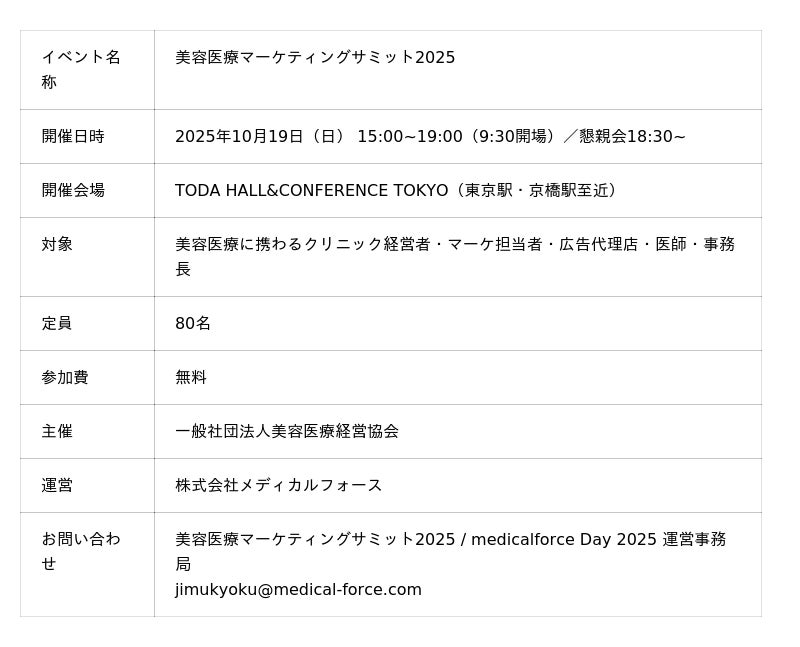 美容クリニック向けのオールインワンSaaS「medicalforce」ならびに「マーケティング・ブランディング支援サービス」を提供する株式会社メディカルフォース(所在地:東京都品川区、代表取締役CEO:畠中 翔一)は、美容医療のマーケティング領域にフォーカスした業界特化型オフラインイベント「美容医療マーケティングサミット2025」を、2025年10月19日(日)にTODA HALL & CONFERENCE TOKYOにて開催いたします。