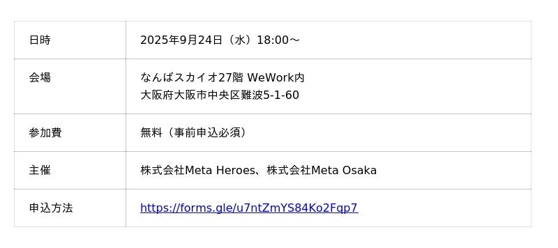 株式会社Meta Heroes(本社所在地:大阪府大阪市、代表取締役:松石和俊、以下「当社」)は、グループ会社である株式会社Meta Osaka(本社所在地:大阪府大阪市、代表取締役:毛利英昭、以下「Meta Osaka」)と共同で、2025年9月24日(水)18:00より「生成AI提案書ワークショップ」を開催いたします。本イベントは、なんばスカイオ WeWorkにて行われ、ChatGPTを中心とした生成AIの基礎から応用までを、90分で実践的に学べる無料イベントです。