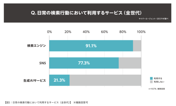 普段、検索行動をする際に利用するサービスについて聞いたところ、1位「検索エンジン」(91.9%)、2位「SNS」(77.3%)である一方、21.3%が「生成AIサービス」を利用していると回答。