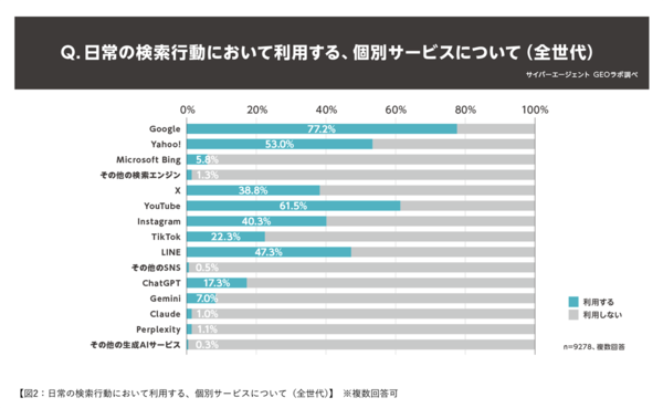 個別の利用サービスでは、検索エンジン「Google」(77.2%)がトップだが、生成AIサービス「ChatGPT」も17.3%に上る。