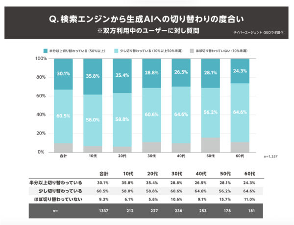 現在も検索エンジンの代替として生成AIを利用しているユーザーに対し、検索エンジンから生成AIへの切り替わりの度合いを質問したところ、全体の30.1%が「検索エンジンから生成AIに半分以上切り替わっている」と回答。