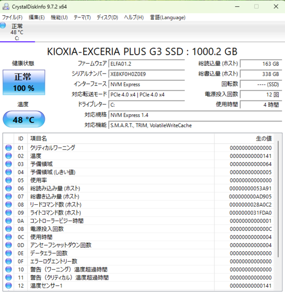 SSDはモニタリングソフト「CrystalDiskInfo 9.7.2」で詳細を見ると、キオクシアの「EXCERIA PLUS G3」の1TBモデルであることが確認できた。しっかりとPCI Express 4.0×4で接続している。