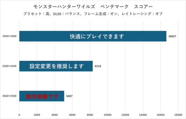 モンスターハンターワイルズはベンチマークソフトを使用。グラフィックプリセットは「高」、DLSSのアップスケーリングモードは「バランス」、フレーム生成は「ON」、レイトレーシングは「OFF」に設定した。解像度はフルHD・WQHD・4Kの3パターン。