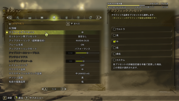 モンスターハンターワイルズは重量級のゲームだけあって、WQHDと4Kは最高設定だと厳しいと言わざるを得ない。フレーム生成を適用しても60fpsを下回ったので、本機で遊ぶ場合はグラフィック設定を下げるほかないだろう。
