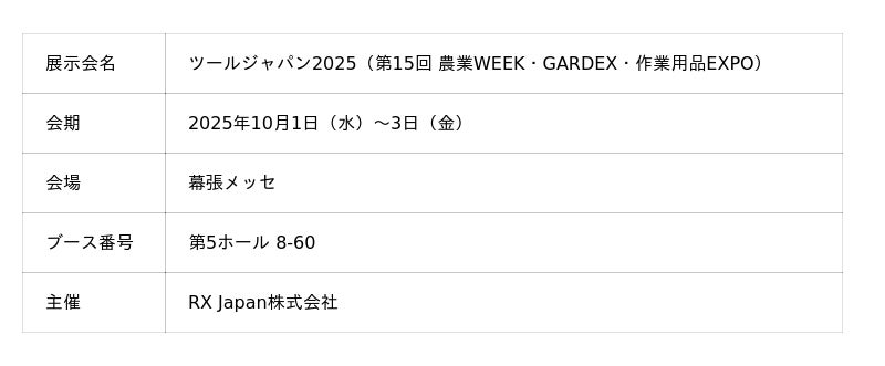 * 展示会名:ツールジャパン2025(第15回 農業WEEK・GARDEX・作業用品EXPO)* 会期:2025年10月1日(水)~3日(金)* 会場:幕張メッセ