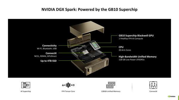 GB10はもともと、研究者や学生のために卓上にAIスーパーコンピューターを提供しようという発想で企画されたものであり、すでに広範に利用され始めているBlackwellをベースとしながら卓上に置けるサイズになるようにスペックを落とした構成である。