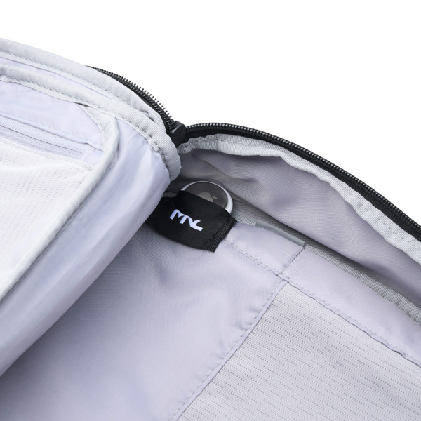 メイン気室内部のネームタグはAirTagを入れることができるポケット仕様。バッグ本体の紛失防止に有用だ。