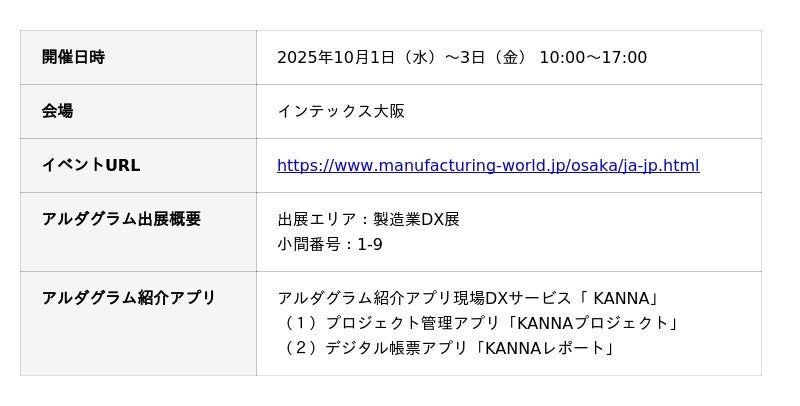 株式会社アルダグラム(本社:東京都港区、代表取締役:長濱光、以下、アルダグラム)が提供する現場DXサービス「KANNA(カンナ)」は、2025年10月1日(水)から3日(金)に、インテックス大阪で開催される「第28回 ものづくり ワールド [大阪]」に初出展します。